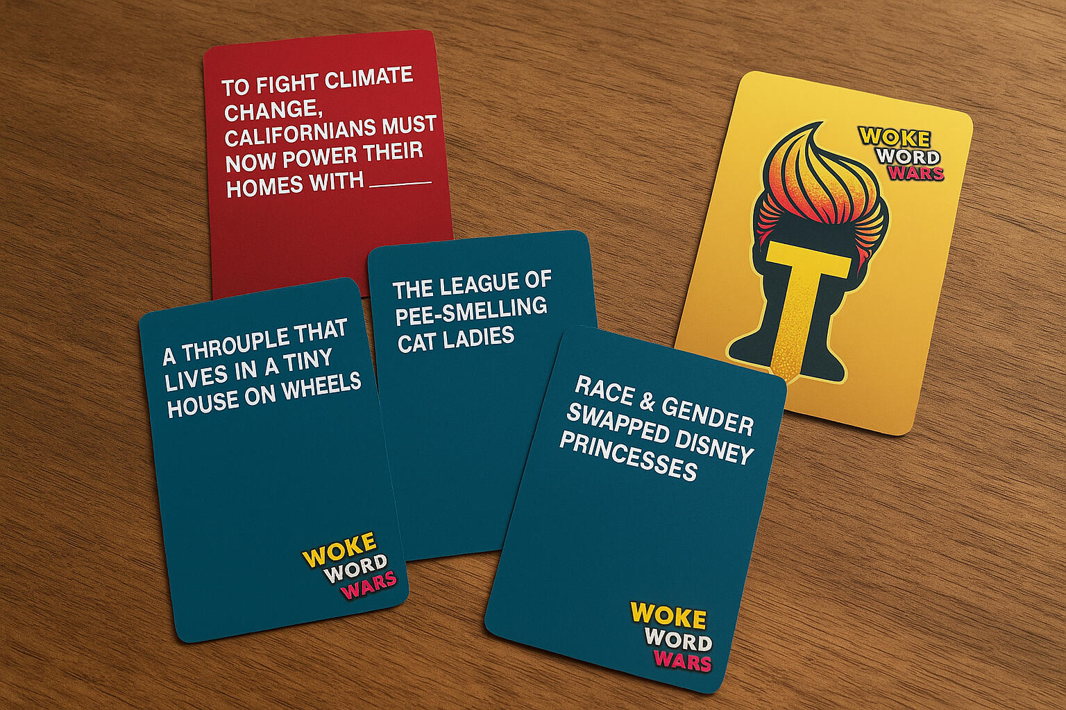 Los Angeles, CA, November 13, 2025 — Woke Word Wars, the ridiculously funny adult party card game where satire meets meltdown, is threatening safe spaces and giving students new grievance studies material as it makes its formal debut this month. In Woke Word Wars, players predict the progressive apocalypse, offend their friends, and earn points for surviving the culture war in a unique new format that provides twists, burns and shunning in polite society.Each Woke Word Wars deck contains 100 prompts, 400 player responses and 20 trump cards. Every round, one player draws a Trigger card — a spicy prompt. Everyone else drops anywhere from 1–3 Woke Word cards to craft the funniest, most disturbingly plausible response. The Judge picks a winner, someone throws a tantrum, and the round moves on. First to 7 wins (unless they get cancelled first). However, “trump” cards add a spicy trick to turns, as players can swoop in twice a game to attempt to steal someone else’s answer and create utter chaos. But never forget: you can always trump a trump.“Woke Word Wars is a game that we had to make as an outlet for everyone sick and tired of being told not to complain, not to question, not to think and not to laugh at the absolute insanity and stupidity rampant in politics and society,” said creator Brian McWilliams. “While our game is going to appeal to some audiences more than others, if you can’t take a joke and enjoy Woke Word Wars, you probably have purple hair, horn-rimmed glasses, and pronouns in your bio.”Woke Word Wars, which is available through Amazon.com in the United States with orders set for delivery in mid-November, 2025, encapsulates the most ridiculous trends, political figures, movements, organizations and social contagions that have run rampant in our modern world for its Trigger card prompts. For example, a sample prompt reads: “To Fight Climate Change, Californians Now Have to Power Their Homes With ________. ”Players can tap into answers from simple one card responses like “Street Feces” or “Race and Gender-Swapped Disney Princesses”, or create multi-card answers like “The Harpies of the View” + “Running on French Fry Oil.”The ability to craft add-on responses, or full on sentences gives players creativity to make funnier and funnier answers, while also adding millions of variations in replay.Trump cards add another aspect to playability in that players receive two trump cards every game, which they can use to add a response card to an opposing player’s answer that the judge can consider. If the added card makes that response the funniest of the bunch, the round is theirs! But other players can play trump cards on trump cards, making a mad run to win the round. At the end of the day, however, the judge can tell everyone to “stick it”, and award the win to the original response, meaning your trump took a dump, and you’re out of luck.Woke Word Wars retails at $34.99.More information, pre-ordering and more insulting content can be found at